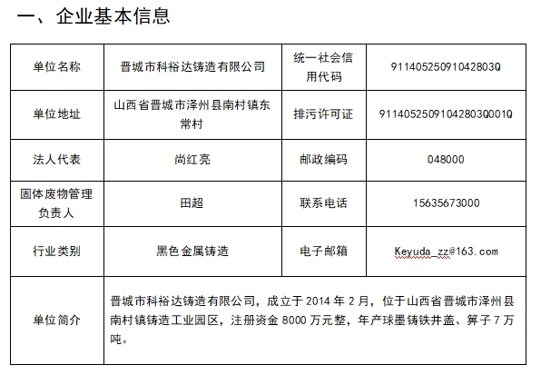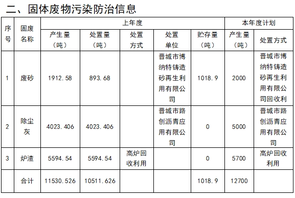 晉城市科裕達鑄造有限公司一般工業(yè)固體廢物信息公開